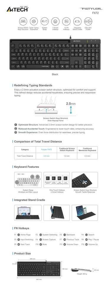 A4tech Fstyler FX72 Wired keyboard, low profile, scissor technology, Cyrillic, black