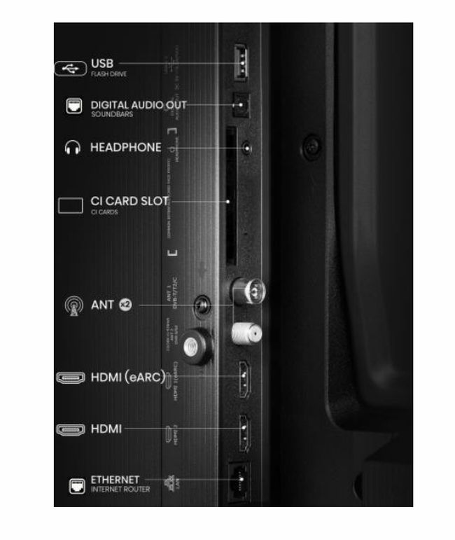 :2 HDMI, 2 USB, S/PDIF out, Headphone, 2 RF, CI+