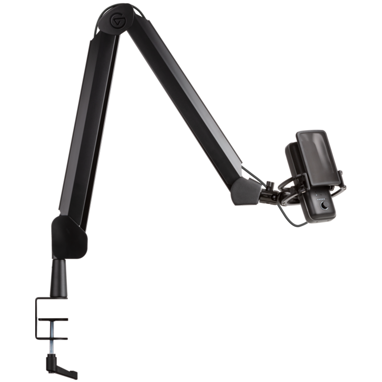 :Wave Mic Arm (High Rise), 360° arm rotation, Padded clamp, Cable channels, Detachable riser, Compatible with 1/4", 3/8" and 5/8" mic mounts, Counterweight: 260g
