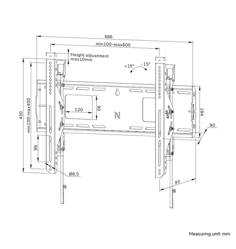 Height: 43 cm (adjustment: 1 cm), Width: 68.6 cm, Depth: 9.3 cm, Adjustment type: Manual