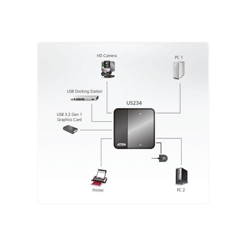 Превключвател ATEN US234, За 2 компютъра към 4 USB 3.2 Gen 1 устройства