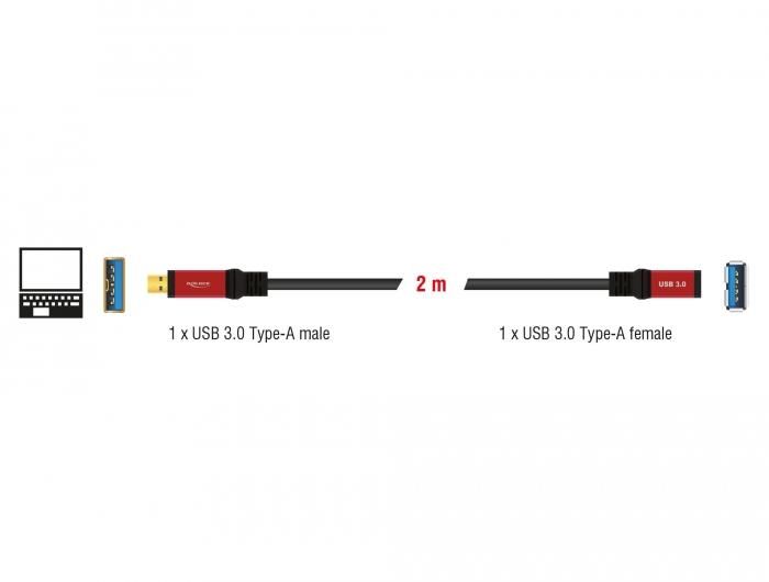 Удължителен кабел Delock USB-A мъжко - USB-А женско, 2 м, Premium, Екраниран, Черен