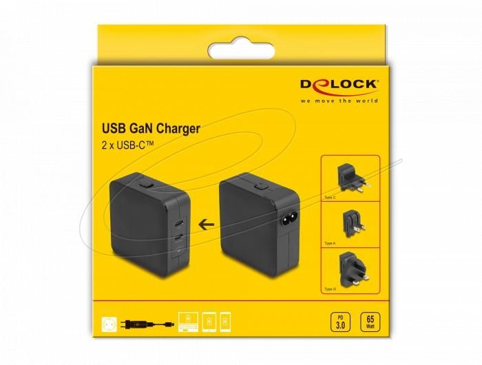 Delock Зарядно устройство GaN, 2 x USB-C, PD 65 W, адаптер за EU / US / UK