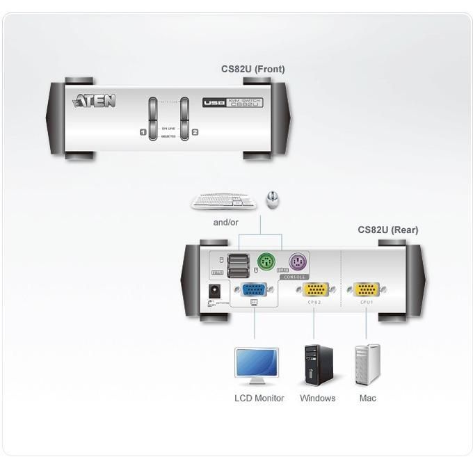 Начало ЕЛЕКТРОНИКА И КОМПЮТРИ Мрежови устройства KVM Суичове KVMP превключвател, ATEN CS82U, 2-портов, PS/2-USB VGA