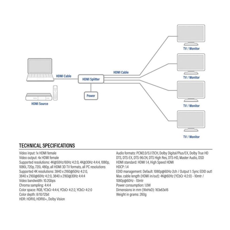 ACT HDMI Сплитер AC7832 4К HDMI сплитер, 1 вход.4 HDMI изхода