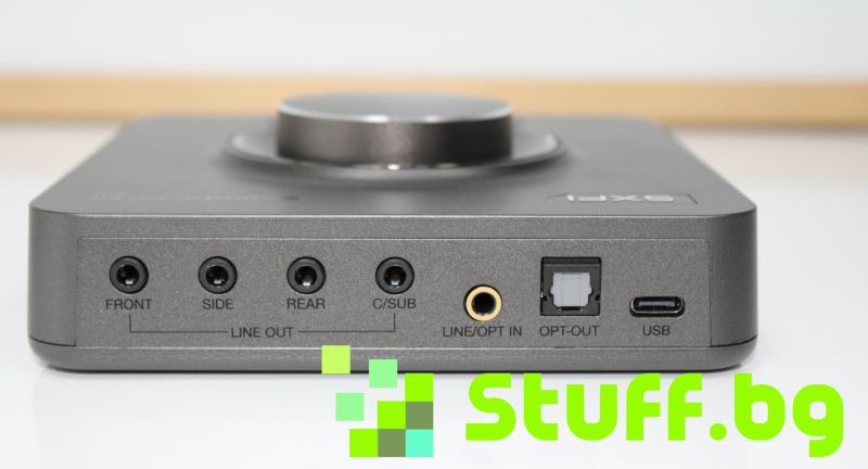 Свързаност: IN: 1 x 3.5mm (microphone), 1 x 3.5mm Line/Optical In, 1 x USB-C / OUT: 4 x 3.5mm (front, side, rear, central speaker / subwoofer), 1x3.5-mm (headphones)