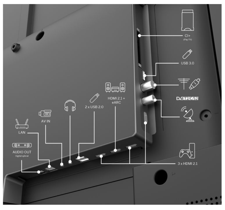 Изводи за свързване:4 HDMI, 3 USB, CI+ slot, SPDIF optical