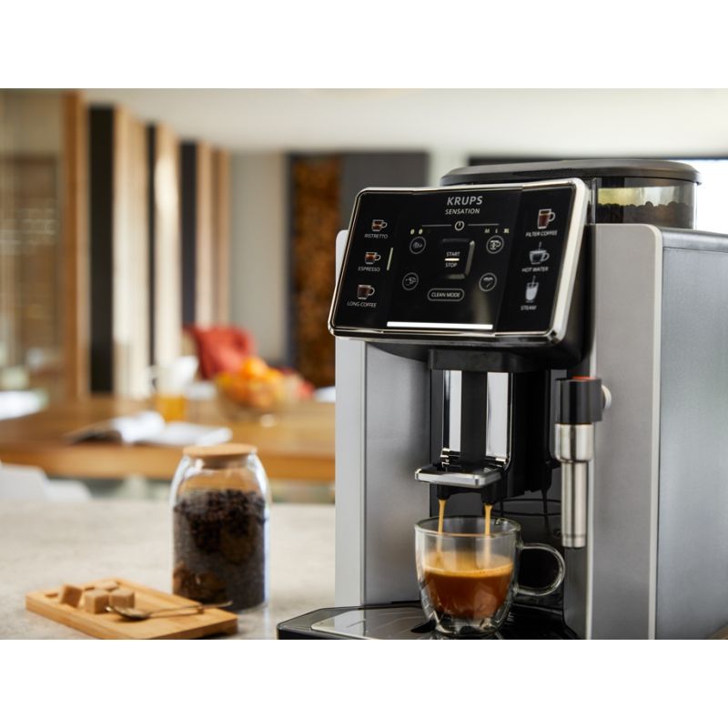 3 coffee temperature settings; Automatic double grind for long coffee (220 ml); Empty water tank indication; Barista Inside; Coffee, Ristretto, Espresso, Long coffee, Filter coffee, Hot water, Steam