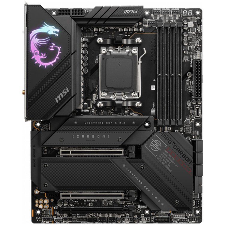MSI MPG X670E CARBON WIFI, ATX, Socket AM5, 4x DDR5, Type-C DP, 3x PCI-E x16 slots, 4x M.2 slots, 1x HDMI, 2x DP (1x Type-C), 6x USB 3.2 Gen2, 1x USB 3.2 Gen2, 1x USB 3.2 Gen2x2, 2x USB 2.0, Type-C, 7.1 HD Audio, 2.5Gbps LAN, Wi-Fi 6E, BT, 3Y