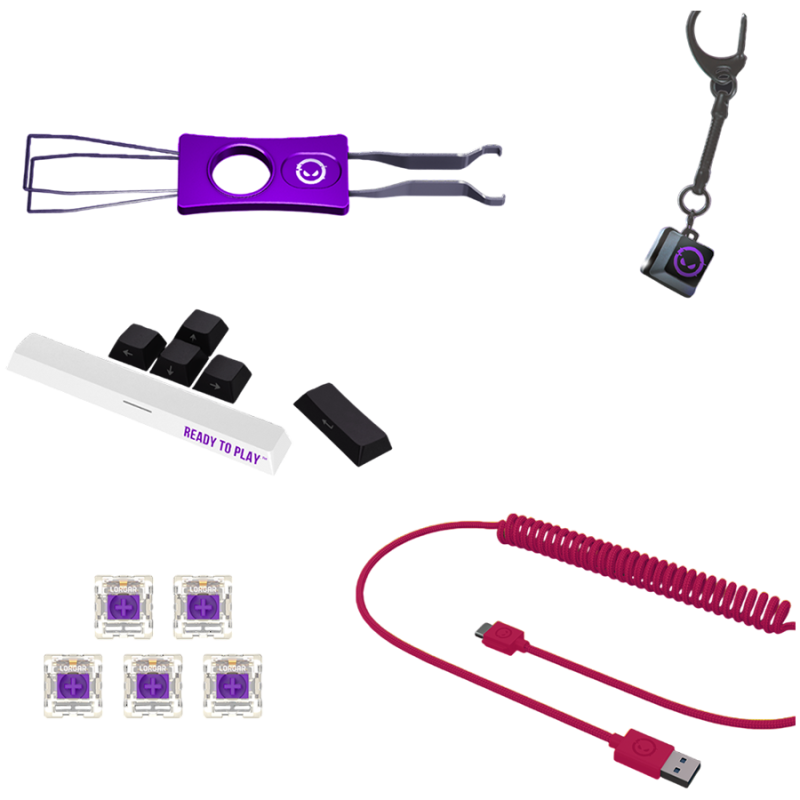 Ключодържател със суич и капачка (заменяема с всеки клавиш), шест резервни капачки, пет резервни суича, четка за почистване, универсален инструмент за сваляне на суичове и капачки, два пакета за загряване на ръце, подложка за чаша и калъф за носене.
