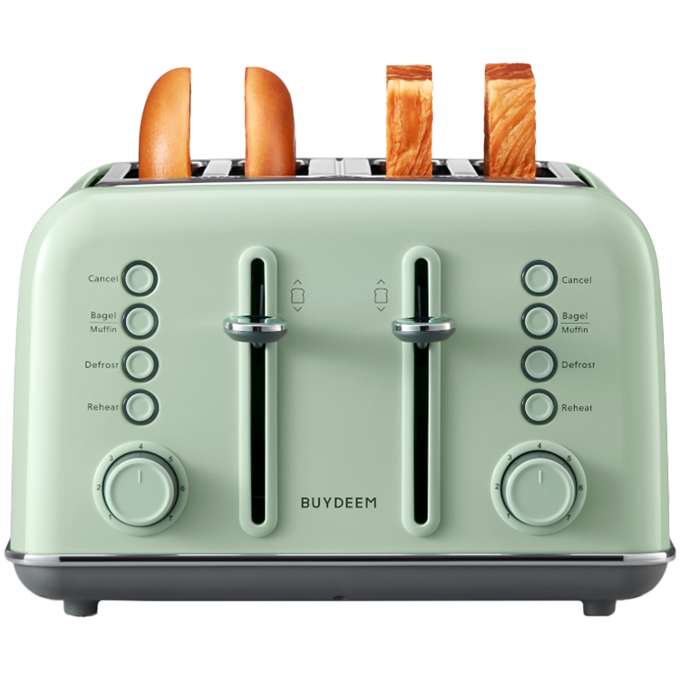 One turn and one press, saves time and effort. LED indicator buttons, function mode at a glance. Kickstart a day with perfect breads from BUYDEEM, retro 4-slice metal toaster which is featured extra-wide slots toast different bagels and muffins. Just enjoy warm bread, bagel or use it to create delicious sandwich.