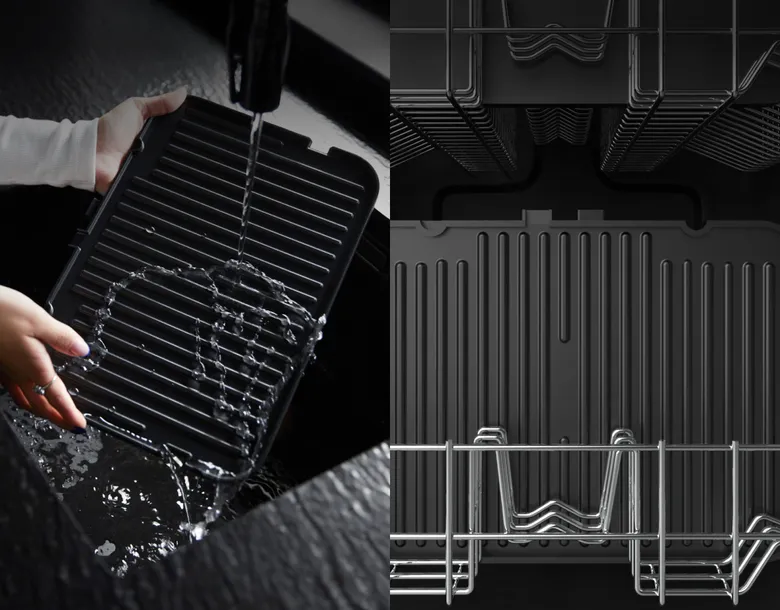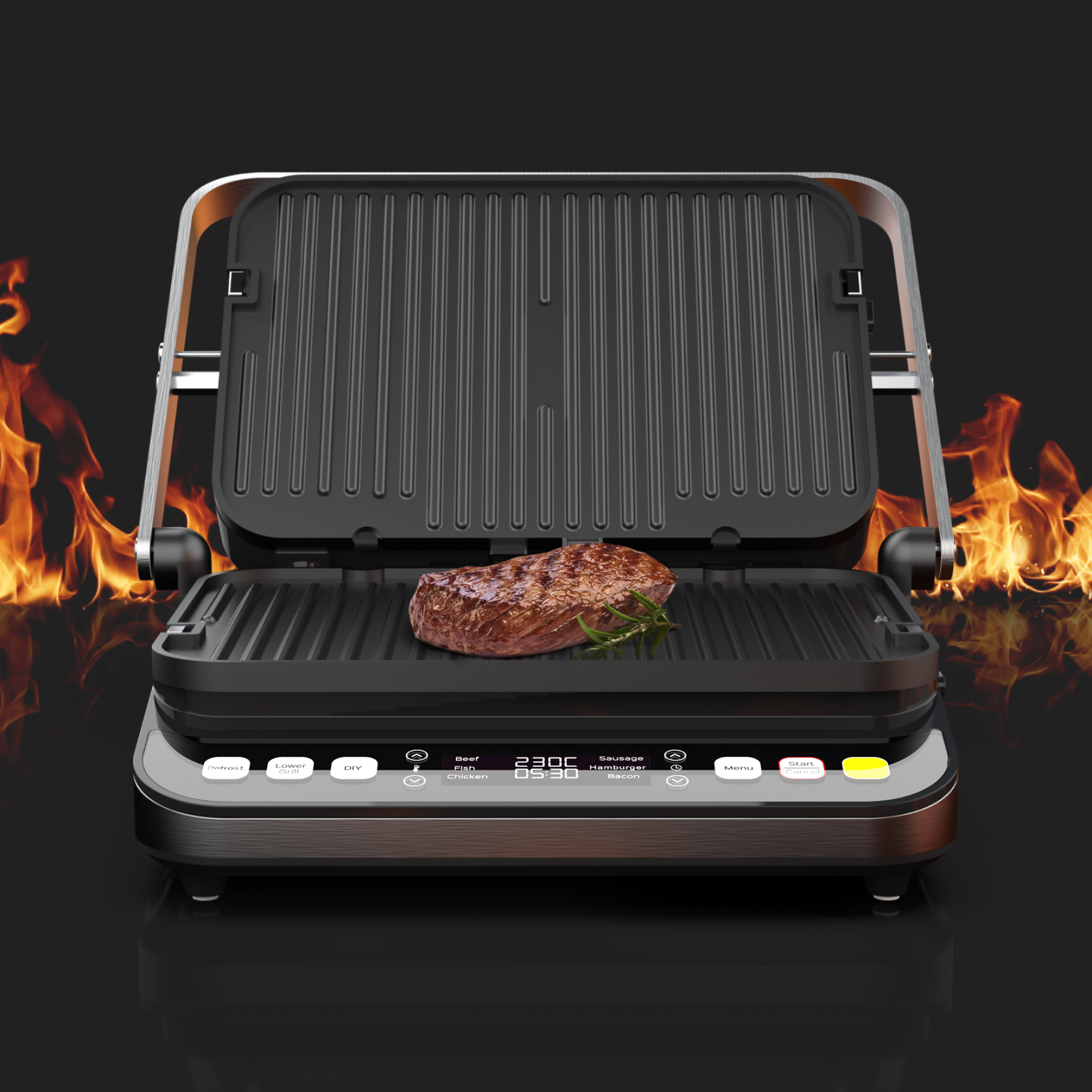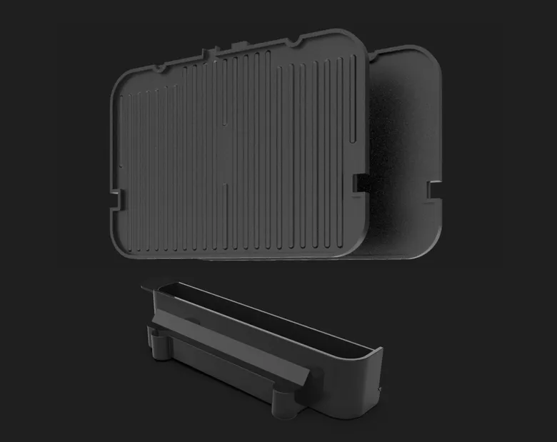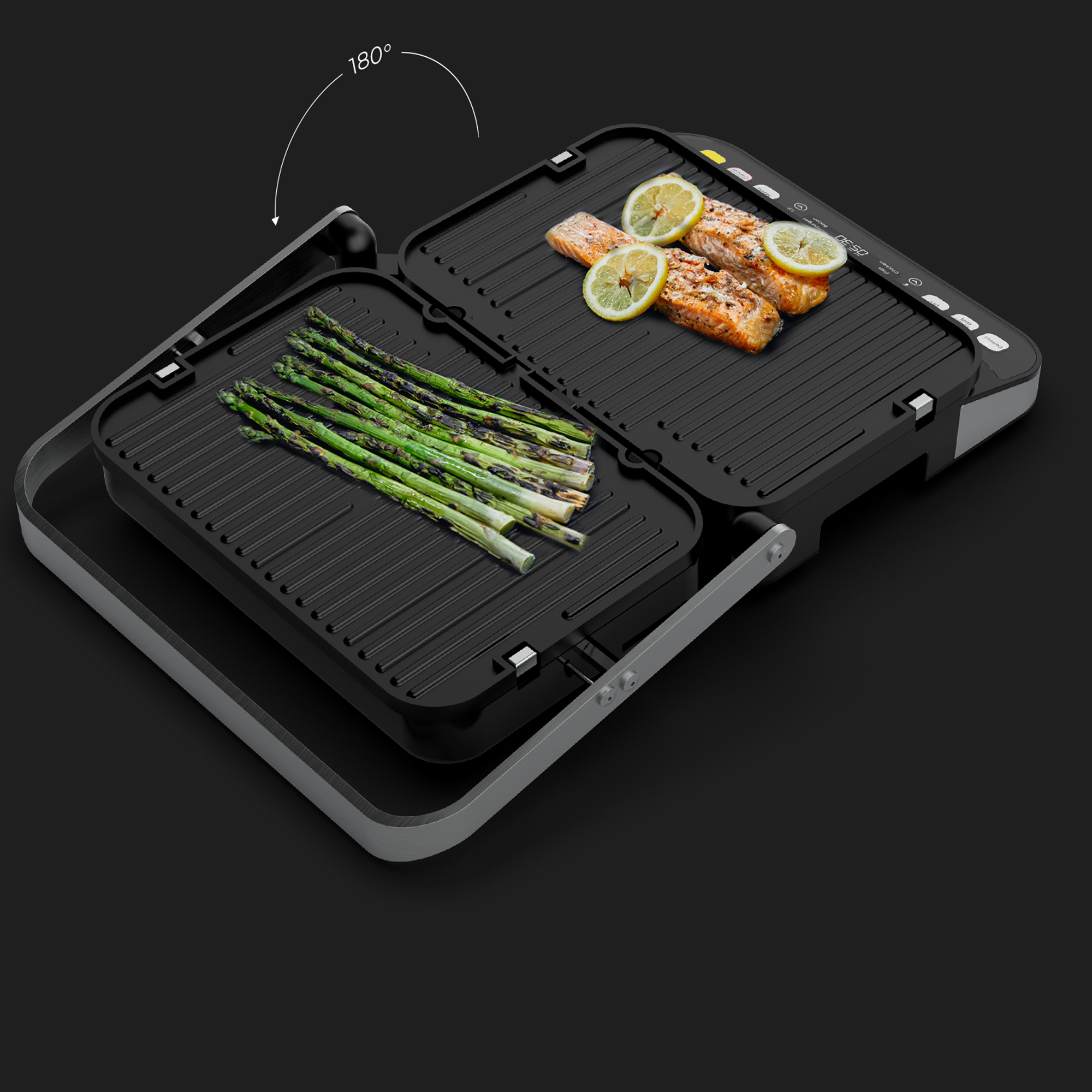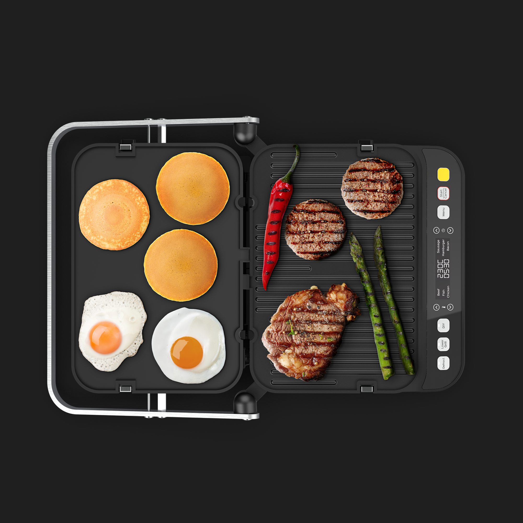 Оребреният панел е идеален за пържоли, риба и зеленчуци. Плоският е идеален за палачинки, яйца или дори пица. Просто обърнете подвижния панел, за да смените повърхността
