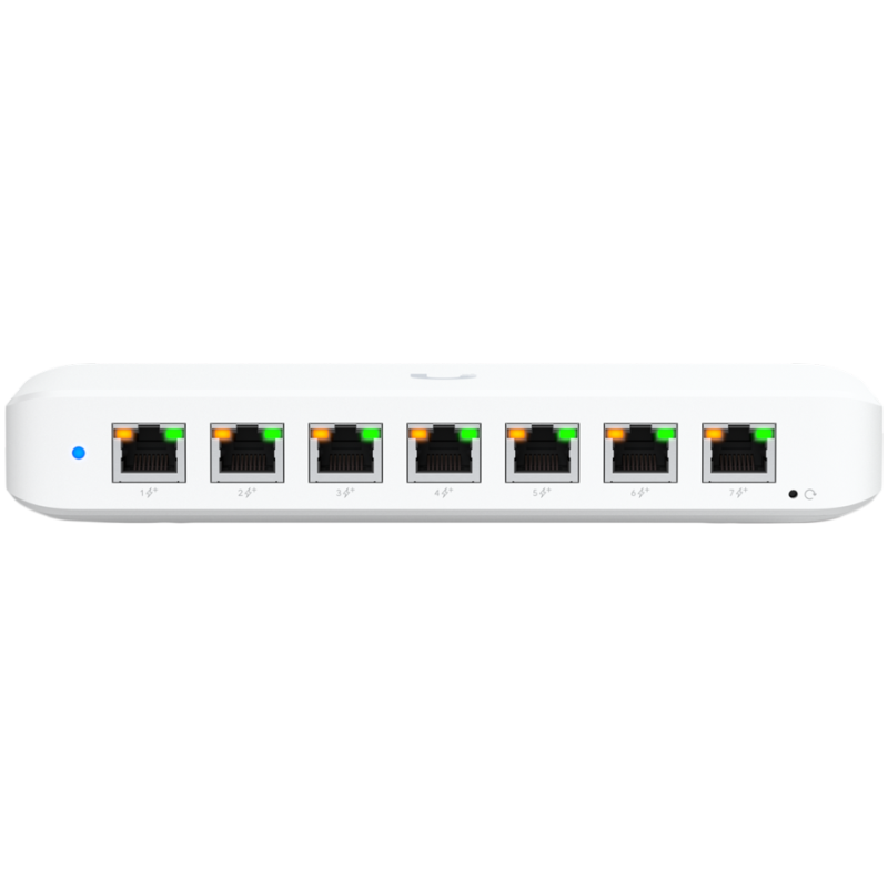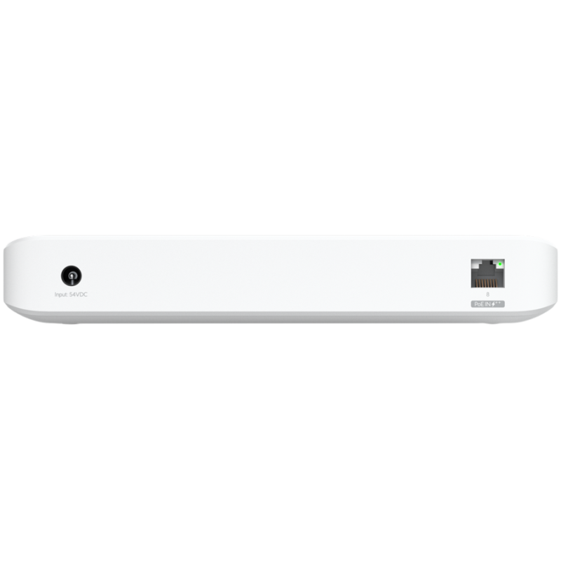 Ubiquiti USW-Ultra-210W-EU compact, Layer 2, 8-port GbE PoE switch with versatile mounting options, 7x GbE PoE+ output ports, GbE port with optional PoE++ input, 202W PoE availability with the included AC power adapter