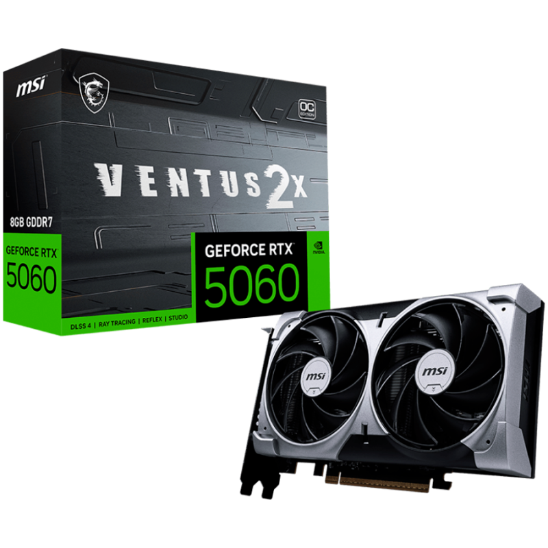 MSI Video Card NVIDIA GeForce RTX 5060 8G VENTUS 2X OC, 8GB GDDR7, 128-bit, 2535 MHz Boost, 3840 CUDA Cores, PCIe 5.0 (x8), 3x DP 2.1b, HDMI 2.1b, RAY TRACING, Dual Fan, 145W TDP, 8-pin PCIe Power, G-SYNC, 2-Slot, 3Y