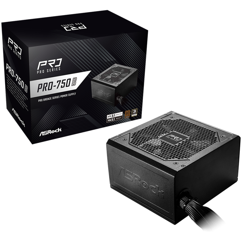 Asrock PRO-750B, 750W, 80 Plus BRONZE, Non Modular PSU, 1x EPS 12V CPU(4+4pin), 2x PCIe (6+2pin), 2x 4-pin connectors, 4x SATA, OCP, SCP, OVP, UVP, OTP, OPP protections, 120 mm Fan, ATX 3.1, 3Y warranty