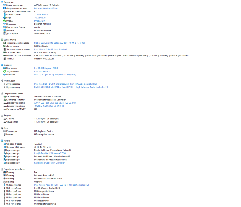 Портове: 1 x HDMI, 1 x DisplayPort, 4 x USB 3.0, 1x RJ-45 Gigabit Ethernet, 1 x 3.5mm combo audio jack, 1 x MMCD/SD card slot