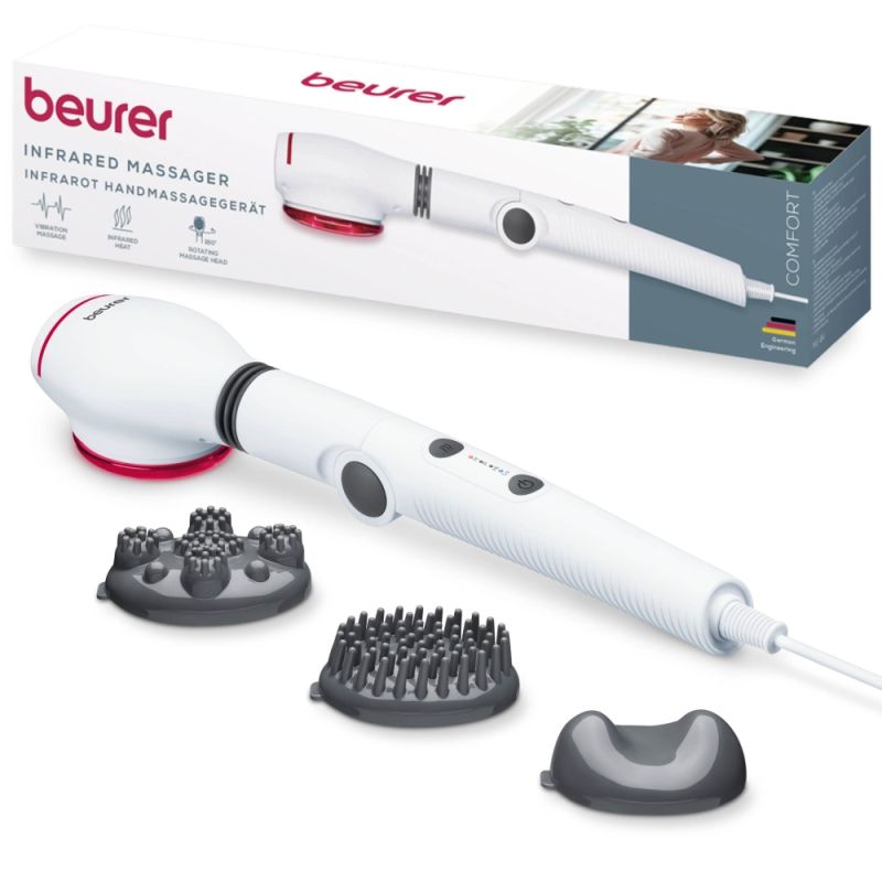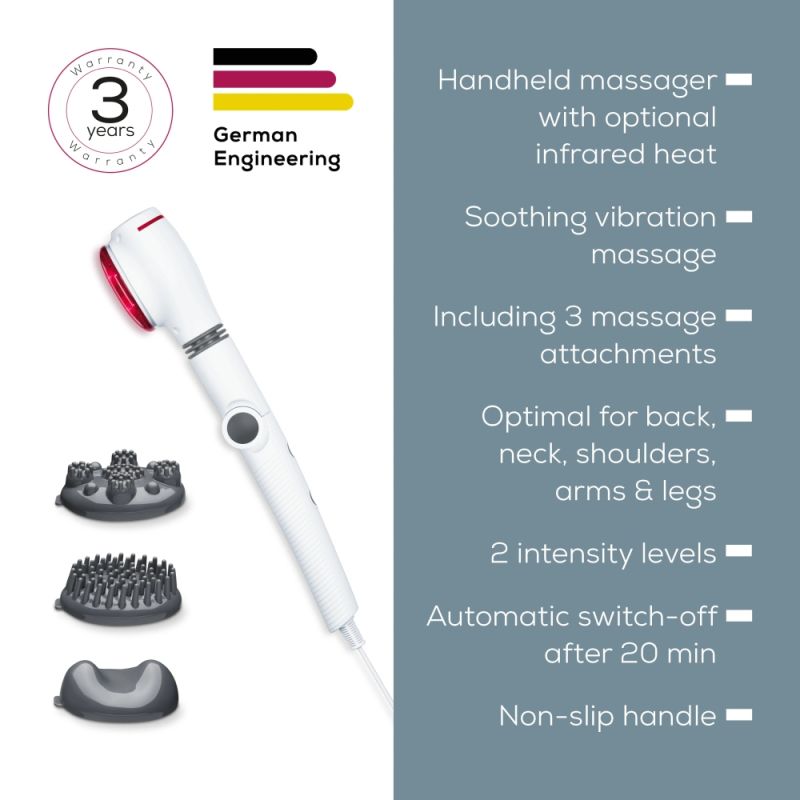 Масажор Beurer MG 44 infrared massager; Soothing vibration massage; Rotating massage head and 3-way adjustable handle; Infrared heat; 3 function levels; 4 interchangeable massage attachments