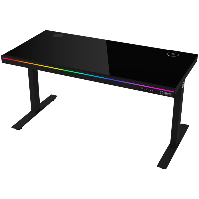 Dual-motor sit/stand adjustable-height gaming desk with wireless charger, RGB lighting, control panel, and USB ports, solid tempered glass tabletop, black.