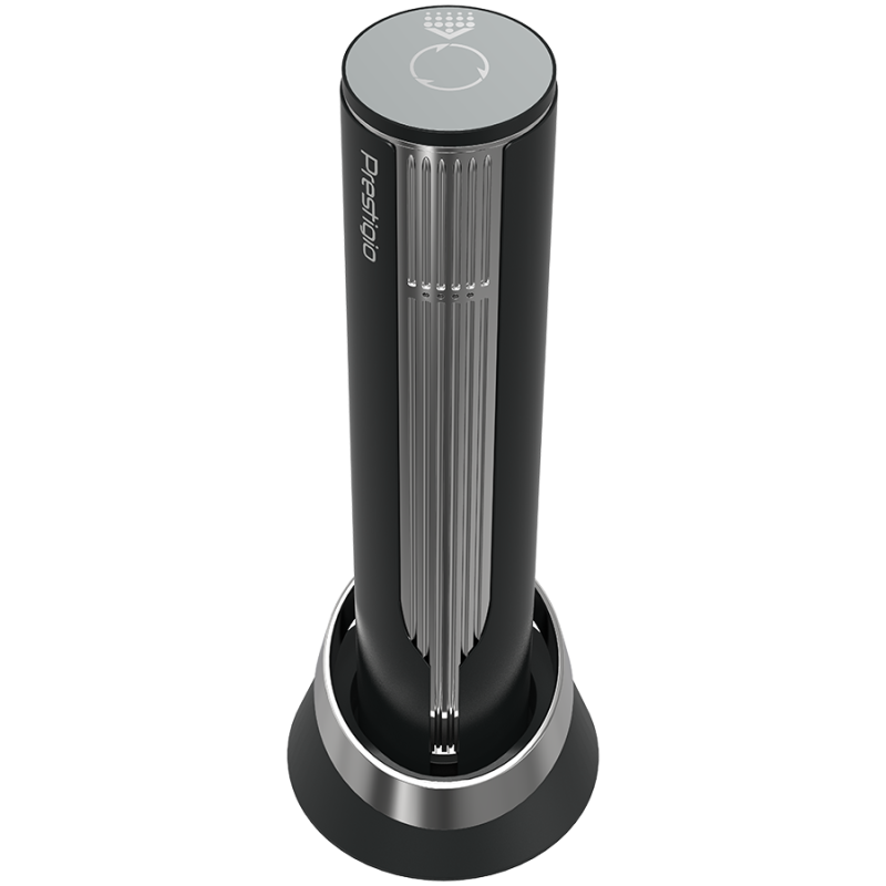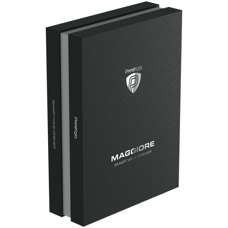 Prestigio Maggiore, smart wine opener, 100% automatic, opens up to 70 bottles without recharging, foil cutter included, premium design, 480mAh battery, Dimensions D 48*H228mm, black + silver color.