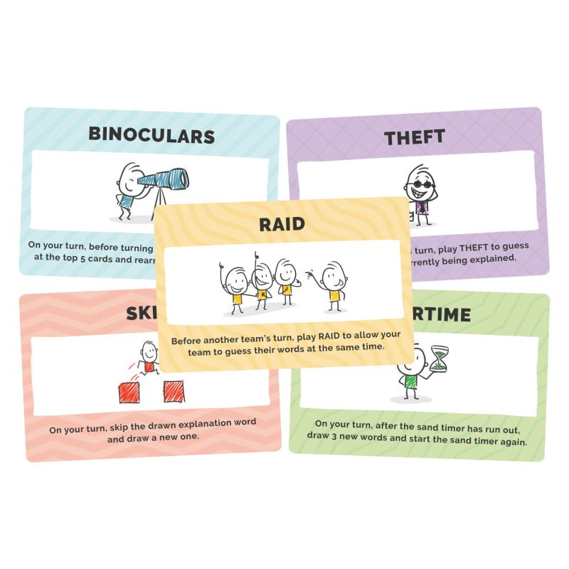 Each team’s turn ends by drawing a special card with powerful effects. The game is played over three rounds, with all words being guessed correctly each round using a different way of giving clues – description, one word, and, mime.