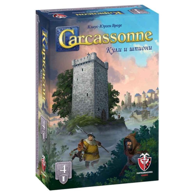 Каркасон – Кули и шпиони е четвъртото разширение на базовата игра. Каркасон е настолна игра, превърнала се в модерна класика и продала над милион копия по цял свят. Голямата ѝ популярност се дължи на лесните и изчистени правила, предоставящи същевременно възможност за разнообразни тактически решения. Развива тактическото мислене докато си прекарвате приятно сред семейство или приятели. Постройте тревни поля, пътища, крепости или манастири. Героите в играта имат ролите на монаси, селяни, рицари и разбойници. Повече територии водят до повече точки. Постройте кули, върху които да качите фигурките си, за да можете да вземете за заложници чуждите фигури и така да накарате опонента си да плати откуп.С това 4-то разширение се пренасяме в третото измерение – ще строим на височина! Най-влиятелните господари на земите около Каркасон започват изграждането на защитни кули, за да подсигурят силата и влиянието си. Техните следовници седят на стража по върховете на кулите и залавят в плен всеки противников елемент, дръзнал да се появи твърде близко в обхвата им. Размяната на пленници обаче може да помогне и на двамата играчи от затрудненото положение. А ако броят на фигурките в нечия свита драстично намалее, всеки има право и да откупи своите заложници. Освен новите игрови идеи и тактики, които това разширение предлага на вече опитните Каркасон-играчи, то съдържа и една стилна и масивна картонена кула, която да служи за хранилище и същевременно за по-лесно теглене на плочките в игра от базовата игра и други разширения.