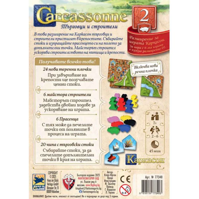 Каркасон – Търговци и строители е второто разширение на базовата игра. Каркасон е настолна игра, превърнала се в модерна класика и продала над милион копия по цял свят. Голямата ѝ популярност се дължи на лесните и изчистени правила, предоставящи същевременно възможност за разнообразни тактически решения. Развива тактическото мислене докато си прекарвате приятно сред семейство или приятели. Постройте тревни поля, пътища, крепости или манастири. Героите в играта имат ролите на монаси, селяни, рицари и разбойници. Повече територии водят до повече точки. Благата трябва да бъдат разпределени, а търговците се борят за тях. В разширението можете да намерите чудесна платнена торбичка за теглене “на тъмно”, която е идеален вариант, ако решите да вземете играта с вас на път. Разширението Търговци и Строители предлага нови варианти за игра – нови теренни плочки със символи на стоки превръщат играчите в градски търговци. Майсторът строител помага за по-бързото разрастване на крепости и пътища. Прасенцето прави добивите от поляните още по-ценни. Платнена торбичка за съхранение и теглене на плочки – допълва комплекта с практичност и удобство.Всички Каркасон (Carcassonne)
