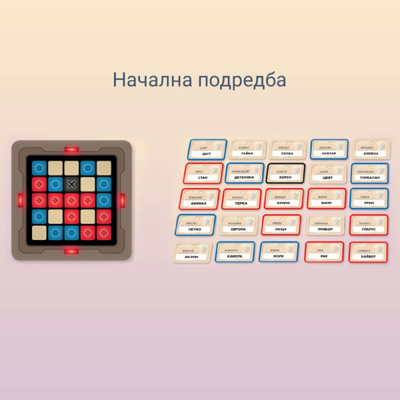 Игралното поле се изгражда от плочки с думи върху тях (кодови имена), които се подреждат 5х5. В играта има координатори, които подават тайните послания. И полеви агенти, които се стараят успешно да разкодират съобщението, за да разкрият шпионите първи. Координаторите стоят от едната страна на масата, а агентите – отсреща. Има карта “шифър”, където са показани местоположенията на всички шпиони, случайните свидетели и убиеца.