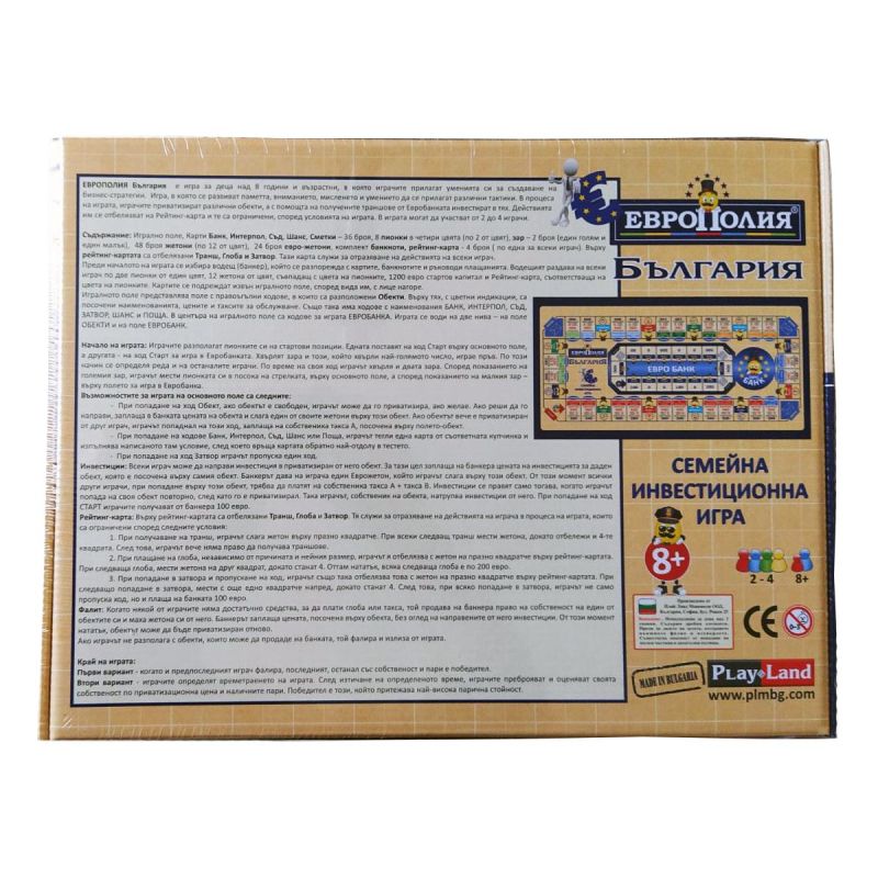 Европолия България е семейна инвестиционна игра. Ще се научите кога трябва и кога не е необходимо да инвестирате парите си. Играйте умно, но не прекалено предпазливо! Имислете своя лична бизнес стратегия и рискувайте, когато сметнете за необходимо. Гарантирано семейно забавление!