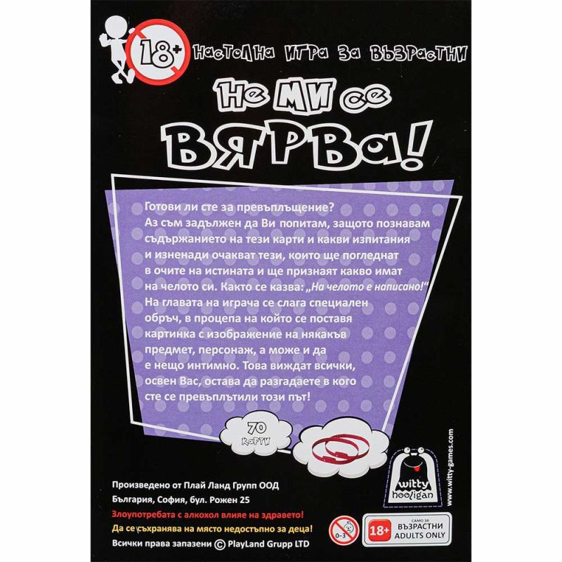Не ми се вярва! е настолна парти игра за възрастни, която забавлява всички. Чрез нея вие се превъплатявате в различни предмети, професии или дори някои интимни неща. Кутията съдържа 70 различни карти, пълни с интересни предизвикателства, изненади и изпитания. Оттърсете се от всякакви предразсъдъци и познайте какво е написано на картата върху челото ви и спечелете играта!