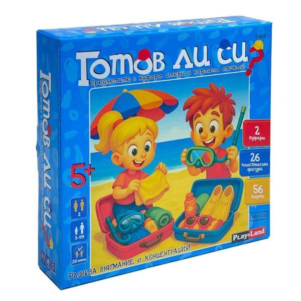 Приготви се за приключение с настолната игра „Готов ли си?“ – забавна и лесна за усвояване игра, подходяща за деца над 5 години и до двама играчи. Всеки участник събира предмети, изобразени на картите, и ги подрежда в своя куфар, за да спечели точки и надпреварата!