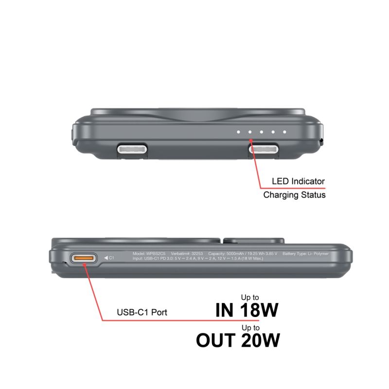 Външна батерия Verbatim Charge 'n' Go 2C Power Bank Magnetic Wireless 5000mAh with 2 USB-C Cables & Stand Grey